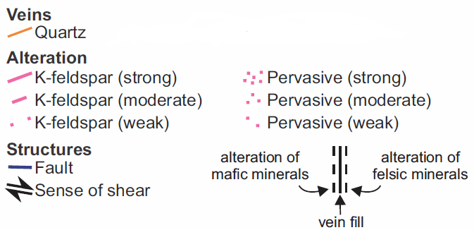 A small area was chosen for detailed mapping, with a high-resolution photograph as a base layer. Instead of just mapping the usual rock units (lithotypes) and structures (…which are beautiful, note the fault offsetting the pink dyke in the centre of the photo…), we also mapped hydrothermal alteration and mineralization. This is very important when it comes to mineral exploration, as the hydrothermal fluids that create veins and alter rocks over a wide area are usually associated with (or are the same) hydrothermal fluids that cause mineralization and ore deposition (i.e. gold, copper). A colour-coated mapping style was used, known as “Anaconda” mapping, which basically is mapping of different alteration assemblages (Einaudi, 1997).